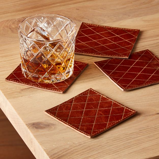 La marca de cuero no sólo incluye cuero en accesorios como posavasos, sino también artículos de cuero para un carrito de bar con un aspecto elegante.