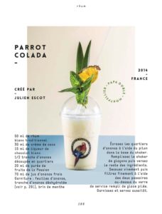 «¡Una piña colada para arrancarle las plumas! La idea era crear un cóctel conceptual, que tuviera su propio logotipo y se sirviera en un timbal de plástico. El loro representado aquí evoca un grabado que teníamos en la pared del bar. Una receta gourmet y afrutada que incluso se puede pedir para llevar. »