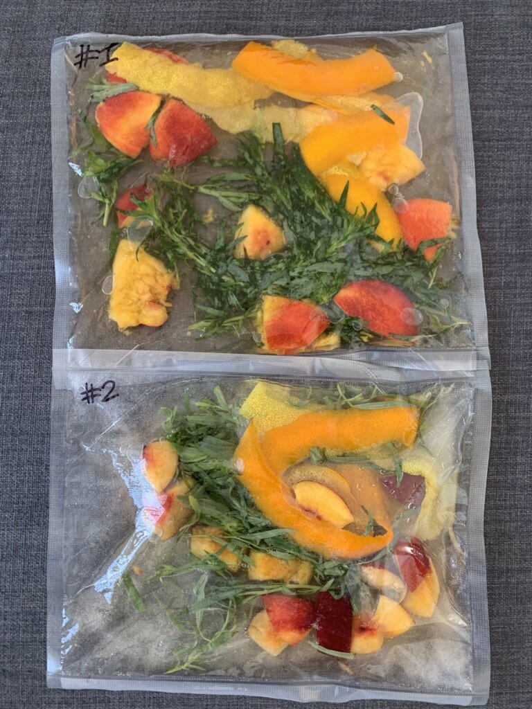 Todo cerrado en una bolsa de vacío y cocinado con sous vide, luego colado con un filtro de café. Así, la bebida se compone de